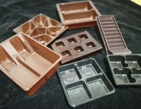 吸塑產品的原材料只有塑膠片材,膠片厚度一般不超過1.5MM,常用的片材有:PVC、PET、PP、PS以及在此基礎上的植絨片材、鍍金片材和防靜電片材。